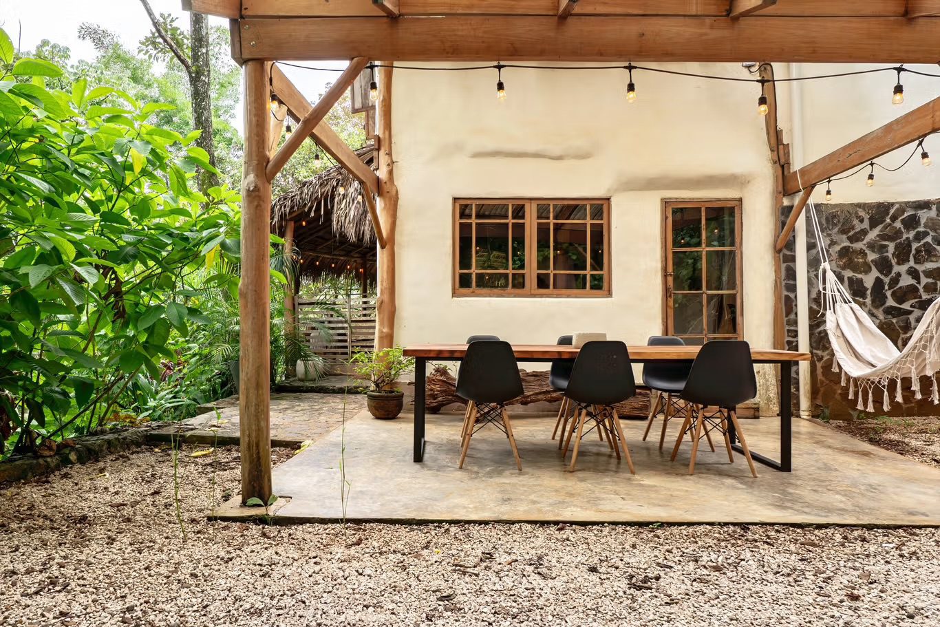 Welcome to Casa Monita, a beautifully crafted eco-home nestled in the serene hills of La Ecovilla, a sustainable community in Costa Rica’s lush San Mateo region. This cozy retreat blends rustic charm with thoughtful design offering guests a peaceful base to relax, explore and connect with nature. Surrounded by an edible landscape, Casa Monita lets you immerse yourself in Costa Rica’s tropical flora. Fruit trees on the property include bananas, pineapple, avocado, lemon, jackfruit and more!